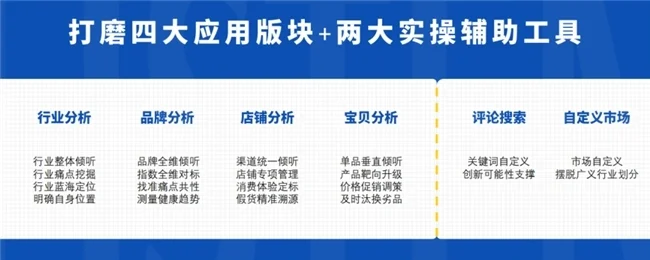 任拓倾听是全域数字零售AI大数据专家Nint任拓旗下推出的消费者反馈洞察工具,拥有四大应用板块和两大实操辅助工具,从行业分析、品牌分析、店铺分析、宝贝分析四大维度,全面掌握市场、行业趋势,了解消费者真实反馈,对标品牌在业内真实表现,从而及时优化本品,调整产品卖点及营销方向。