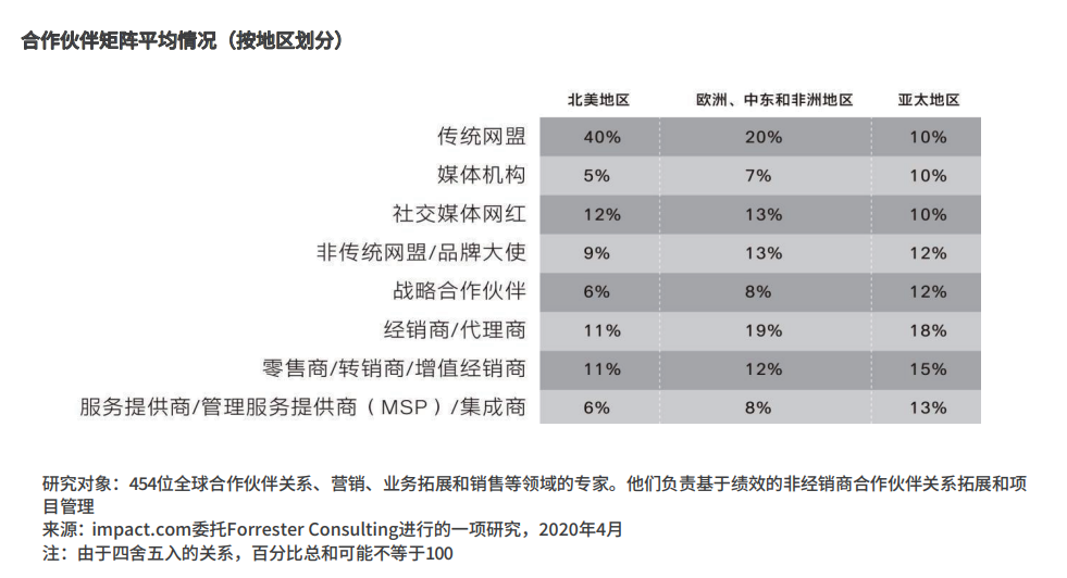 impact.com联合Forrester发布的《全球DTC品牌合作伙伴营销成熟度白皮书》指出,合作伙伴营销矩阵中,大体可以将合作伙伴分为传统网盟、媒体机构、社交媒体网红、非传统网盟/品牌大使、战略合作伙伴、经销商/代理商等。